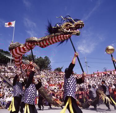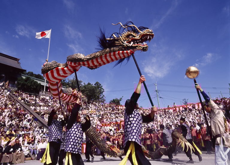 The performances at Kunchi are diverse and spectacular. The most popular is the Dragon Dance (Jya Odori), where a magnificent dragon moves through the streets in a performance symbolizing longevity and strength. Another famous performance is Kokkodesho, a dynamic act from Kabashima town featuring a large drum float carried by young men, accompanied by powerful drumming and chants. These traditional shows are highlights of the festival and crowd favorites.